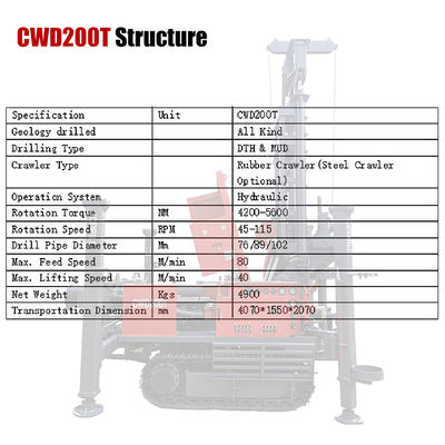 CWD200T Crawler Mounted Rotary Water Well Drill Rig jest przeznaczony do wszechstronnych operacji wiercenia w różnych formacjach geologicznych.Wykorzystuje wiertarki błotowe do miękkich formacji i powietrza DTH młotek do wiertarki skały, z ciśnieniem powietrza do zrzucania złomu, zapewniając znacznie wyższą wydajność niż tradycyjne wiercenia rotacyjne.