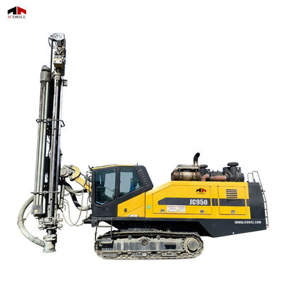 The JC950 is a fully hydraulic open-pit drilling rig, equipped with a cabin, an automatic rod handling system, and a dust removal system.
